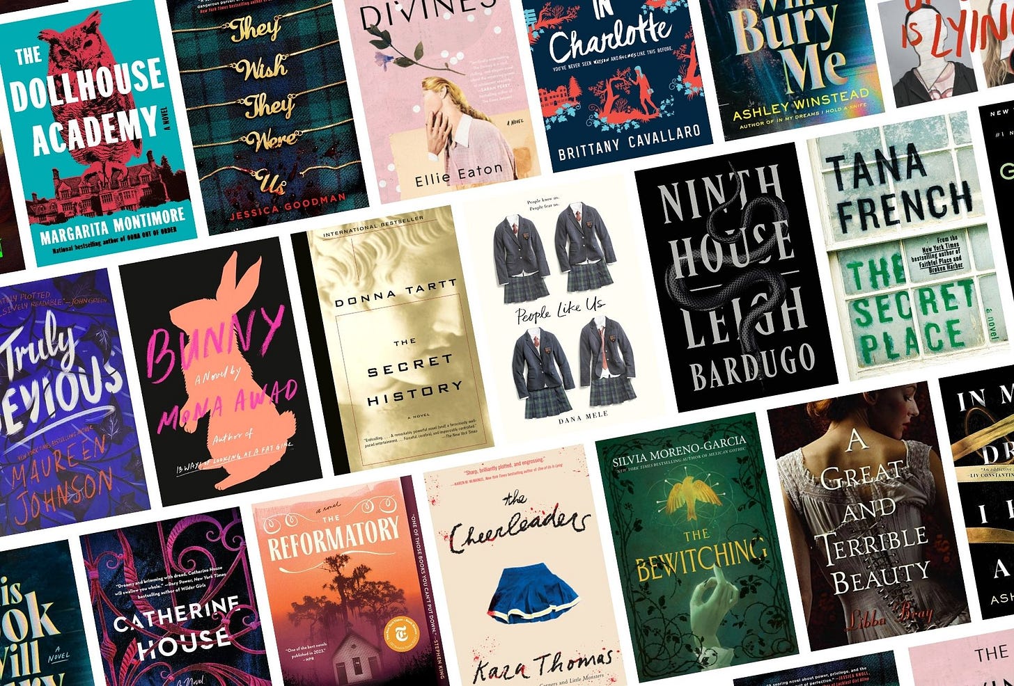 Starting off strong with an icon in weird girl lit. I guess this is less “murders at a boarding school” and more “strange, possibly occult goings-on at a university,” which absolutely counts in my opinion. Our narrator, Samantha Heather Mackey, is attending an MFA program in literature at a highly-exclusive New England liberal arts university. She’s a scholarship student, and couldn’t feel more at odds with the other students in her cohort, especially the enigmatic group of beautiful rich girls who all call each other “bunny” and seem to move and speak as one unit. But Sam catches the Bunnies’ eye(s) and they extend her an invitation to their infamous “smut salon.” As Sam gets more and more entwined with the Bunnies, things start to get seriously weird – with potentially deadly consequences. It’s like Mean Girls meets Heathers meets The Craft, and I’ve loved it since the beginning.