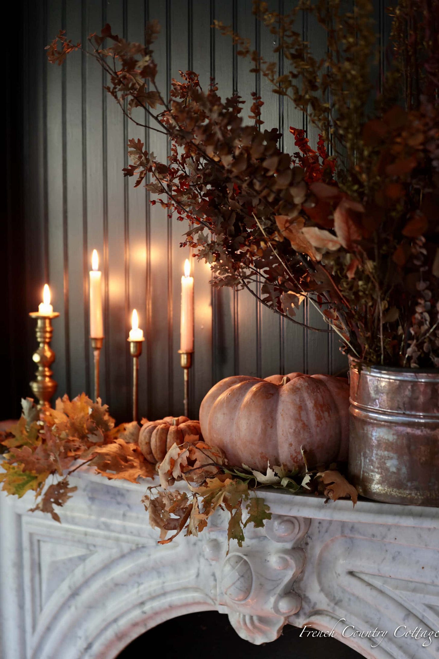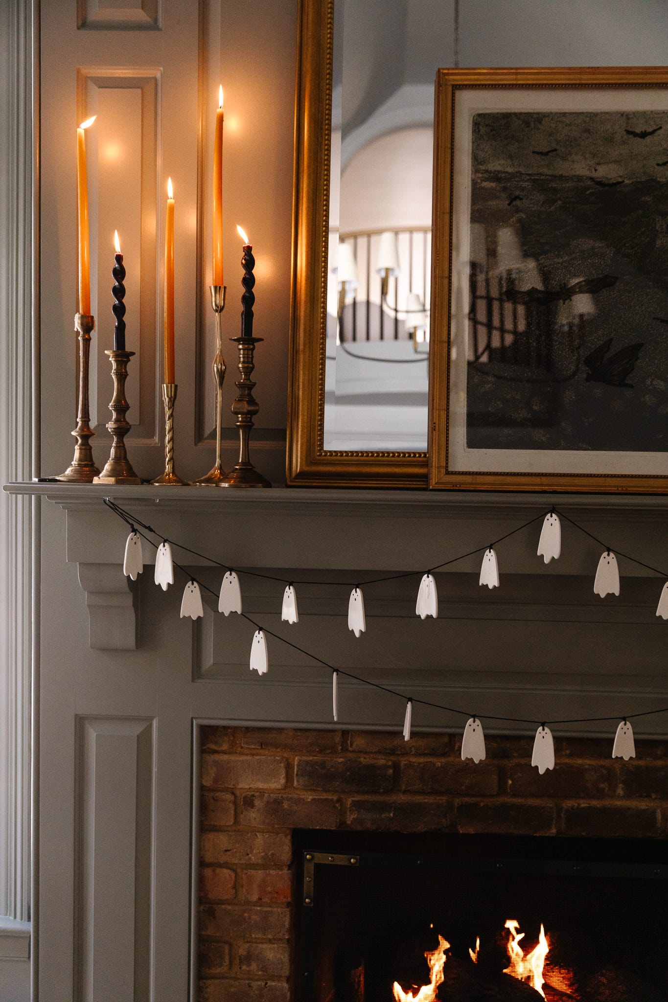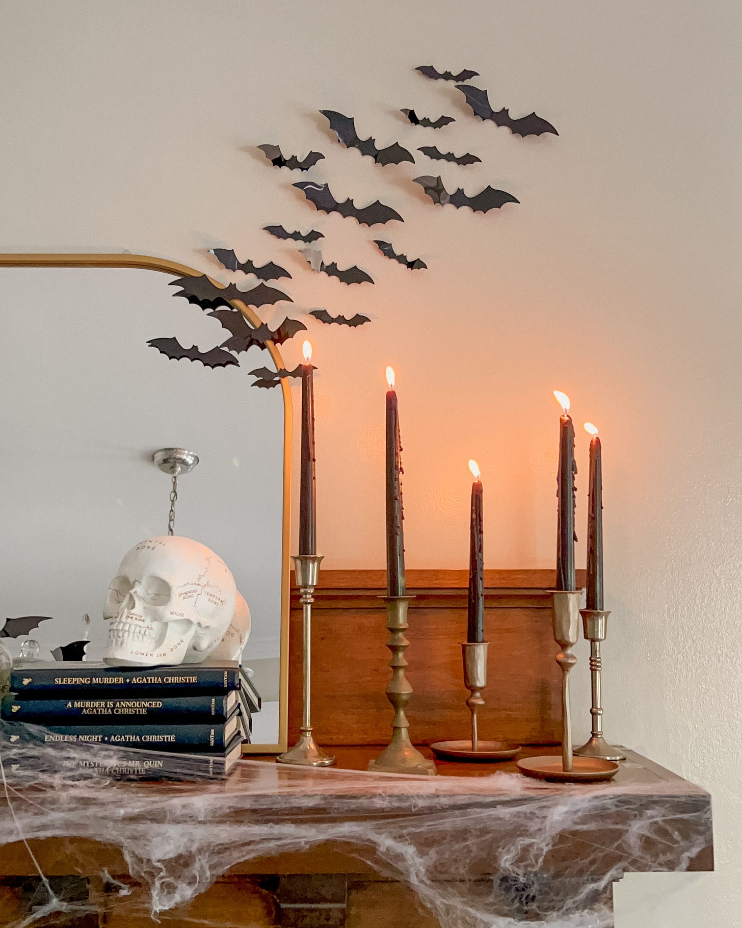 There’s nothing I love more than a big collection of mismatched brass taper candle holders on my mantle. For Halloween, I love to get black or dark red taper candles, and hold a lighter to them so they get nice and drippy looking.